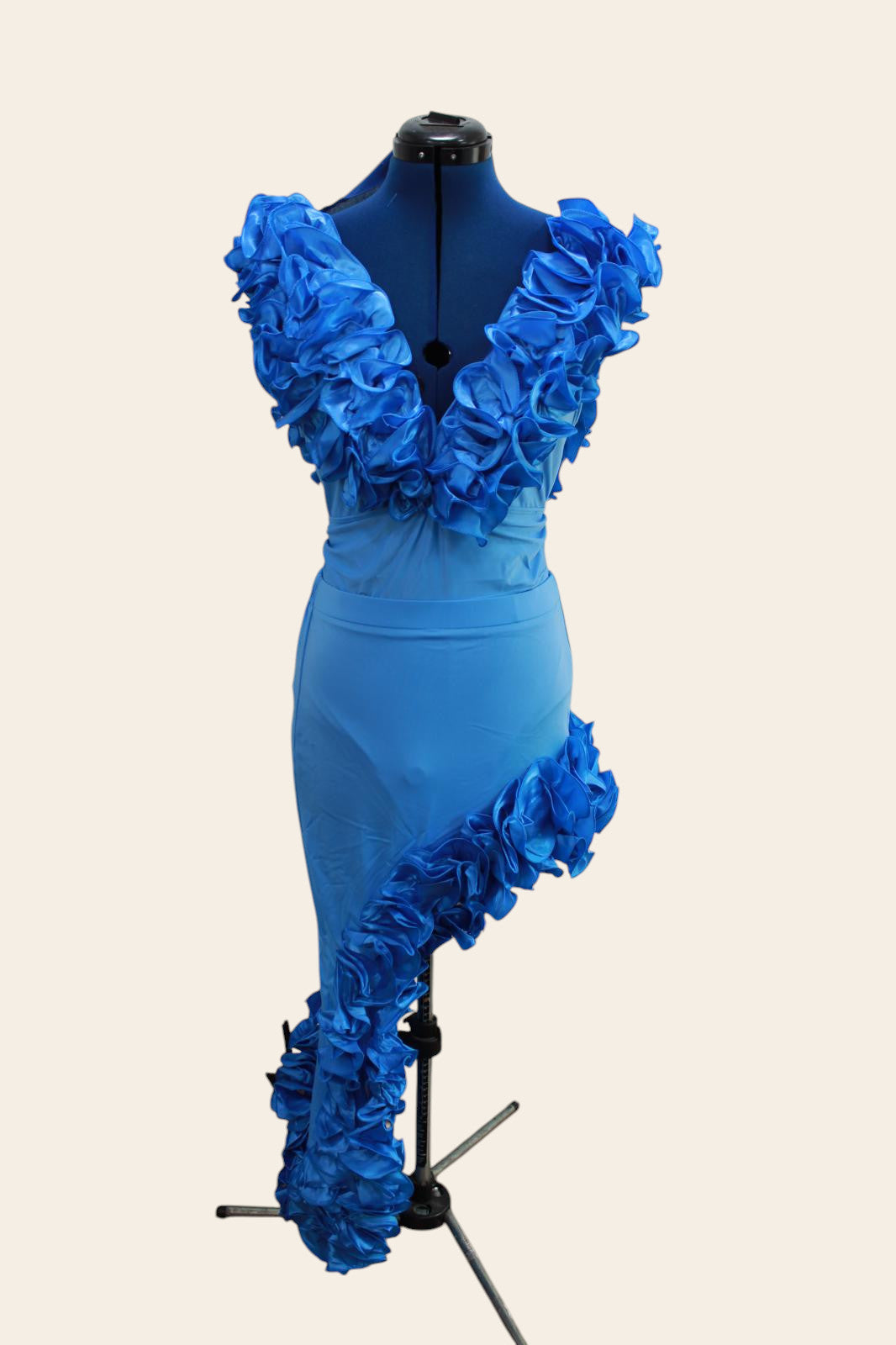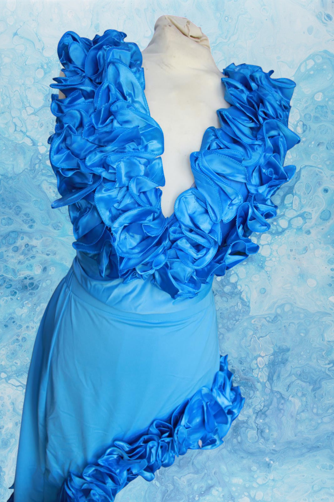 Step into elegance with this striking satin blue dress, designed to turn heads with its bold details. The dress features a deep V-neckline, lavishly adorned with cascading ruffled accents, adding volume and drama to the silhouette. Crafted from smooth satin fabric, it drapes beautifully along the body, while an asymmetrical hemline trimmed with matching ruffles gives it a dynamic, flowing finish.