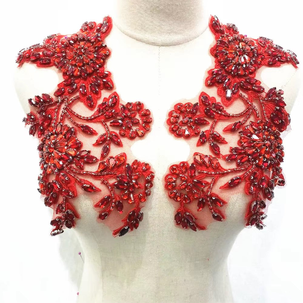 Rhinestone appliques available in RED, perfect for bridal dresses, formal wear, and accessories. Made with crystal material, these sparkling lace appliques are customizable with personal artwork or samples. Delivery in 5-11 days,