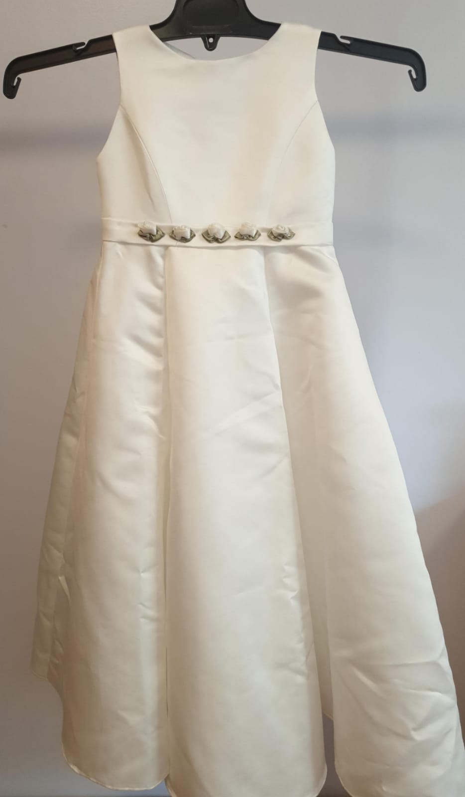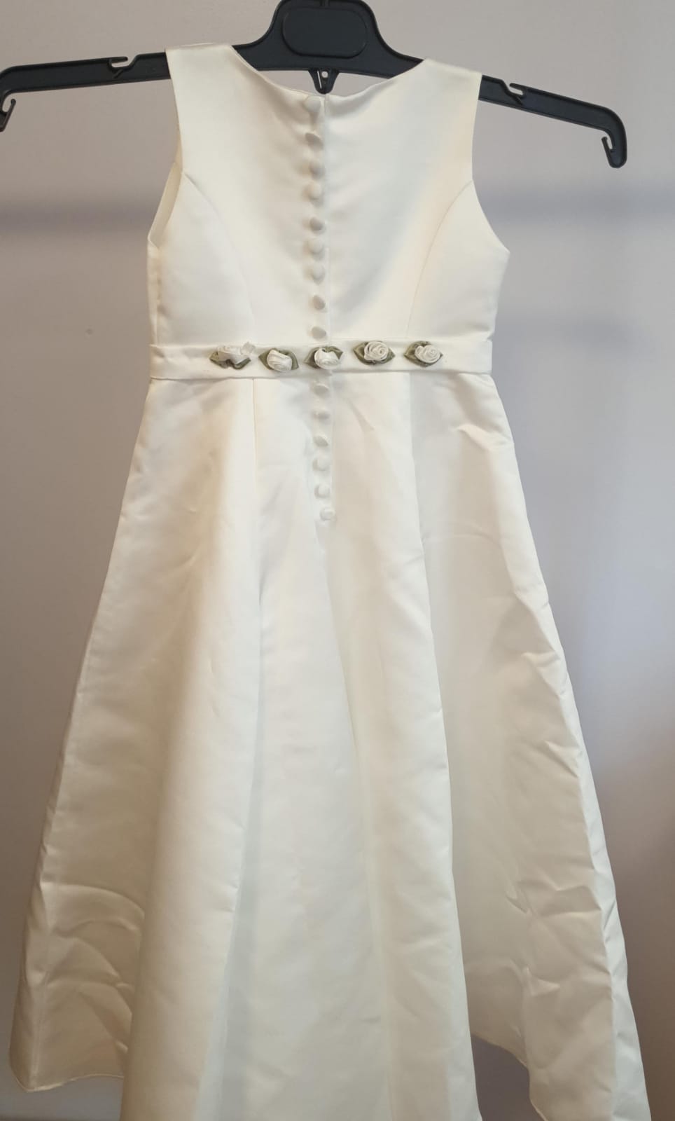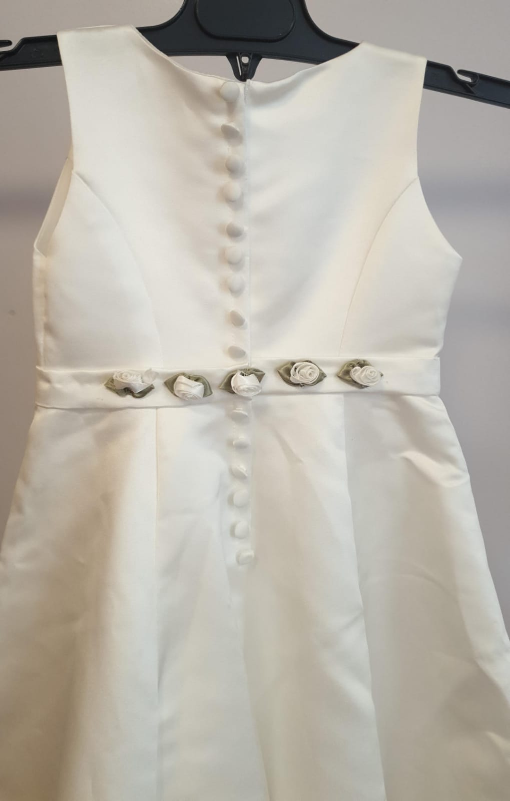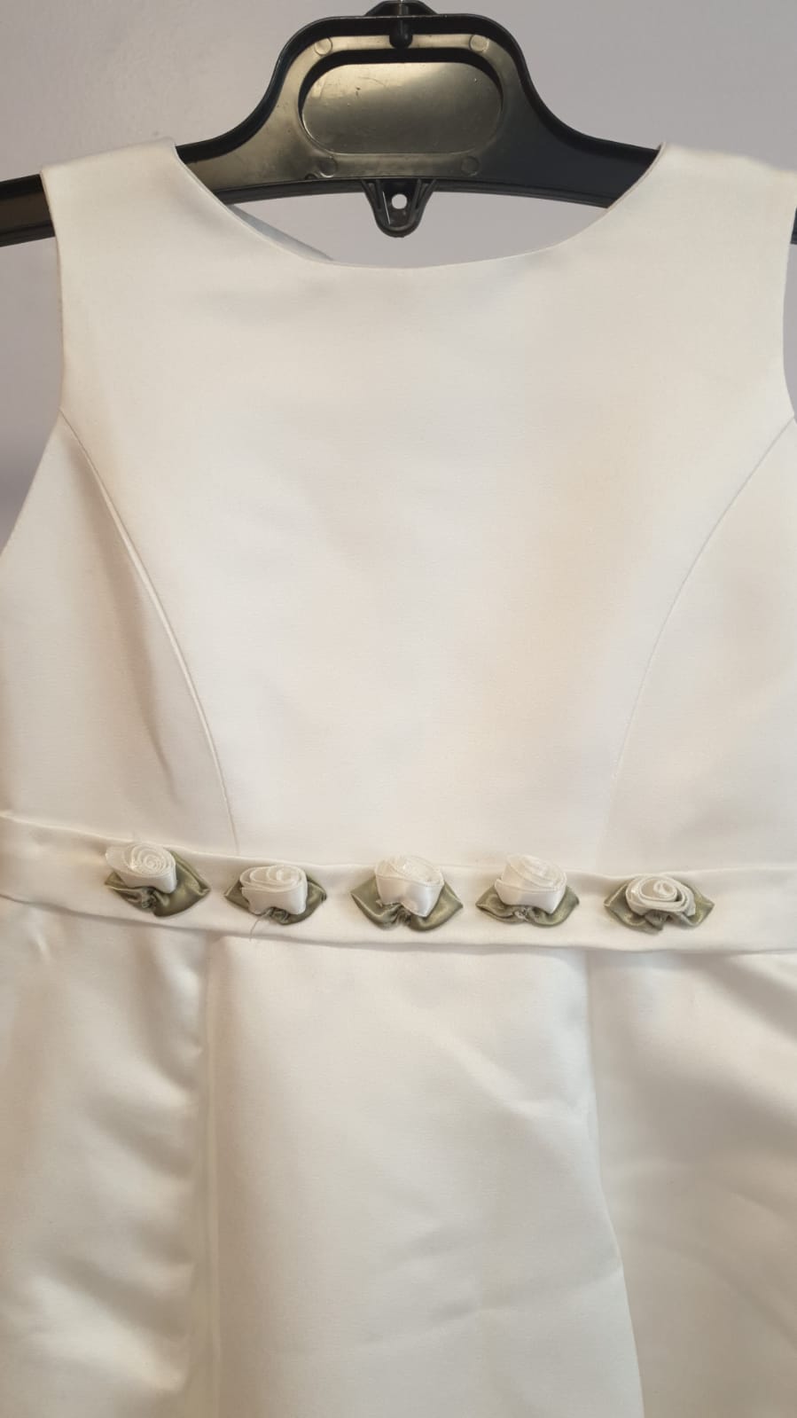 "Ibaiza Silk White Baby Dress with Green Flowers – A soft silk dress in pure white, adorned with delicate green floral accents. Elegant, comfortable, and perfect for special moments."